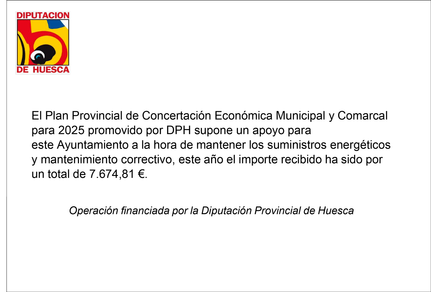 El Plan Provincial de Concertación Económica Municipal y Comarcal para 2025, promovido por la Diputación Provincial de Huesca (DPH), supone un apoyo fundamental para este Ayuntamiento a la hora de mantener los suministros energéticos y el mantenimiento correctivo.