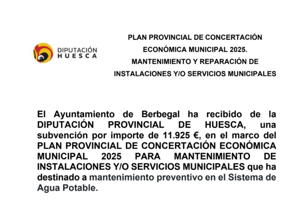 Desde el Ayuntamiento de Berbegal os informamos de que hemos recibido una subvención de la Diputación Provincial de Huesca por importe de 11.925 €, dentro del Plan Provincial de Concertación Económica Municipal 2025.